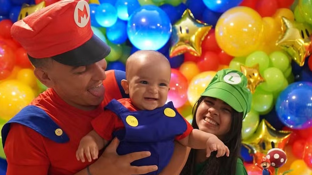 João Gomes e Ary Mirelle festejaram os 11 meses do filho, Jorge, com uma festa com tema do Super Mario Bros, nesta segunda-feira (16). A