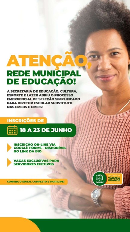 Os servidores efetivos da rede municipal de educação, com formação adequada, têm vagas exclusivas A prefeitura de Várzea Grande, por meio da Secretaria Municipal de