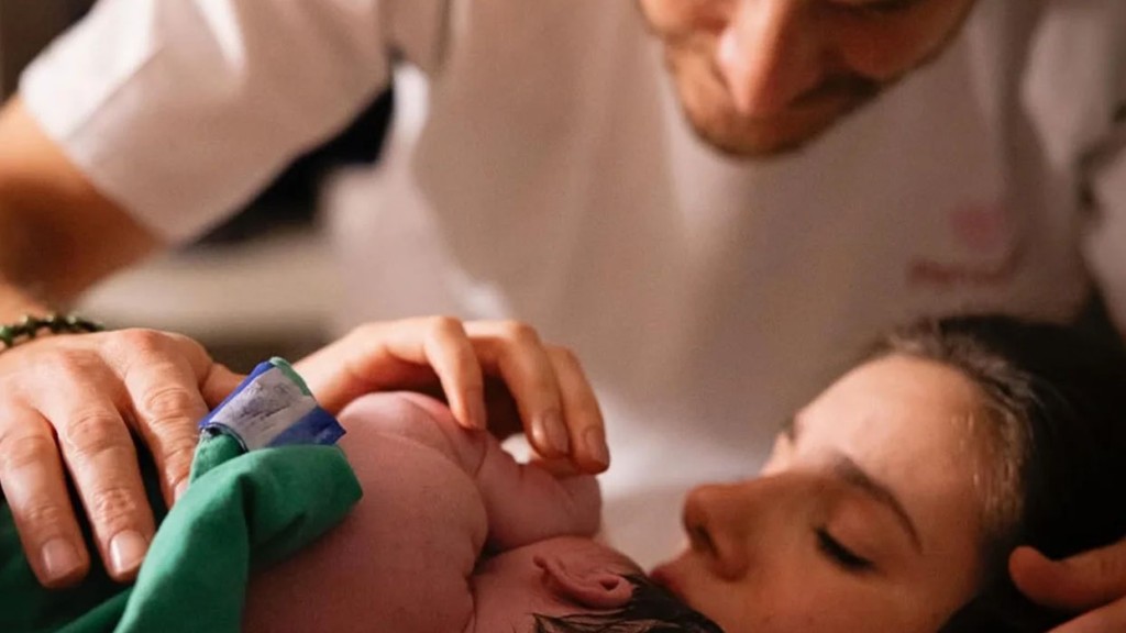 Camila Queiroz se derrete ao mostrar cachorro ‘cuidando’ da filha recém-nascida