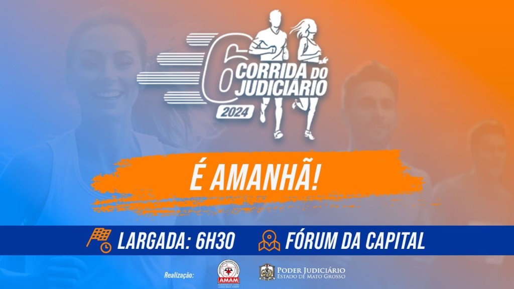 #Paratodosverem. Esta matéria possui recurso de texto alternativo para promover a inclusão de pessoas com deficiência visual. Descrição da imagem: Arte gráfica em formato horizontal com escala de cores azul e laranjado. Ao centro está a marca da 6ª Corrida do Judiciário e na base em uma tarja laranjada está es crito: É amanha! Segue também as informações dos horários de largada para a caminhada e corrida. e os logos do Judiciário e da Amam-MT
