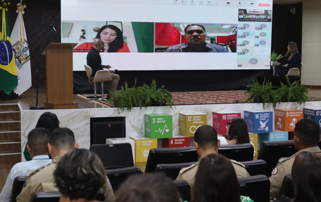 #Paratodosverem – Esta matéria possui recursos de texto alternativo para promover a inclusão das pessoas com deficiência visual. Foto 1: a imagem panorâmica mostra o auditório do TJMT com parte da audiência e o palco onde estão os jornalistas Jorge Sírio e Ianara Garcia. Eles estão olhando para o telão, onde aparecem os jornalistas Michele Mendes e Fábio Diniz, que participaram pela plataforma Teams.