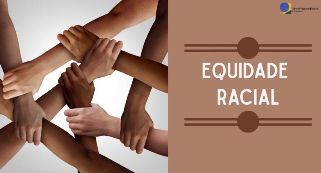 #PraTodosVerem: Imagem na qual, à esquerda, aparecem diversas mãos que seguram em braços com tons de pele preta, parda e branca. À direita, está escrito Equidade Racial, em um fundo marrom. No canto superior direito, está a marca do TRE-MT.