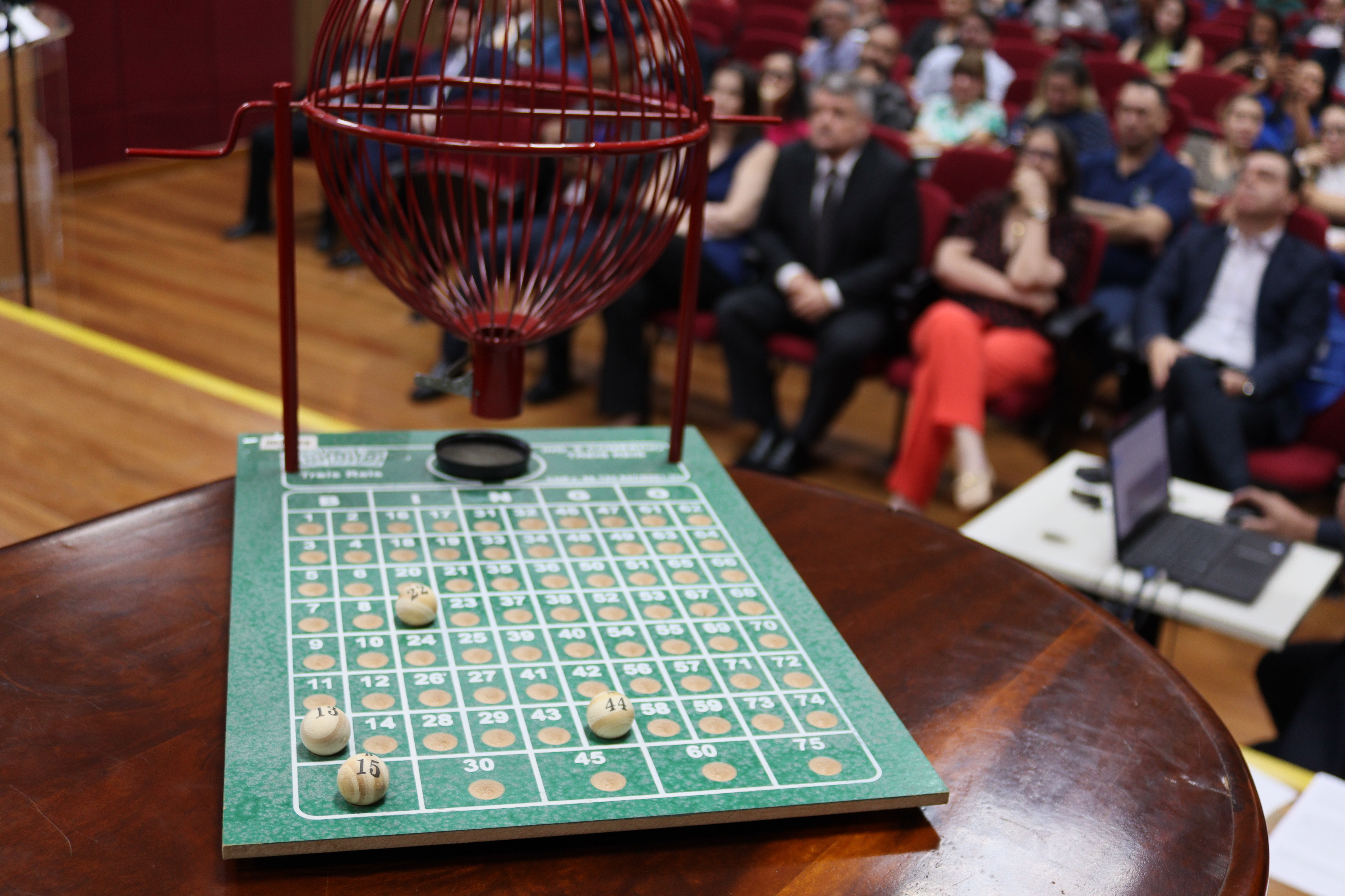 #PraTodosVerem: Foto que mostra, em primeiro plano, um globo de bingo para realização do sorteio e, em segundo plano, pessoas sentadas no Plenário do TRE-MT, que acompanham a audiência pública. Ao final da matéria, tem uma galeria com mais fotos da audiência.