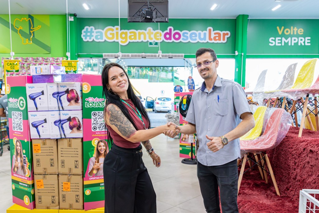 A foto mostra a diretora da Bem-Estar Animal e o gerente da Loja G, da Avenida Miguel Sutil, em um simbólico aperto de mãos, sinalizando a parceria firmada pela causa animal.