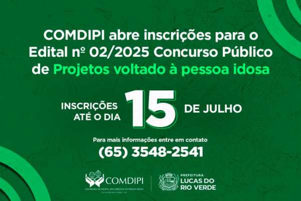 O Conselho Municipal dos Direitos da Pessoa Idosa (COMDIPI) de Lucas do Rio Verde publicou, no dia 27 de junho de 2025, o Edital nº 02/2025, que trata do Concurso Público de Projetos para financiamento por meio do Fundo Municipal dos Direitos da Pessoa Idosa.