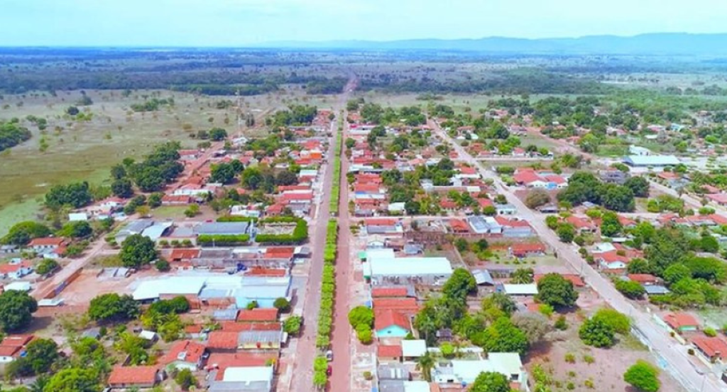 #ParaTodosVerem: A imagem mostra uma vista aérea de uma pequena cidade, com ruas largas e bem definidas, casas térreas distribuídas de forma organizada e abundante vegetação entre as construções. Ao fundo, é possível ver áreas rurais e extensas planícies que se estendem até a linha do horizonte, onde surgem serras ou morros ao longe. O cenário transmite tranquilidade e simplicidade típica de municípios do interior.
