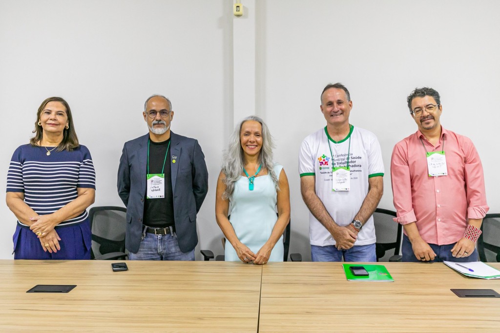 A imagem ilustra cinco pessoas que compõem a mesa diretora da 1ª Conferência Municipal de Saúde do Trabalhador e da Trabalhadora do município de Cuiabá. A mesa é de madeira, e todos estão em pé, posando para a foto.