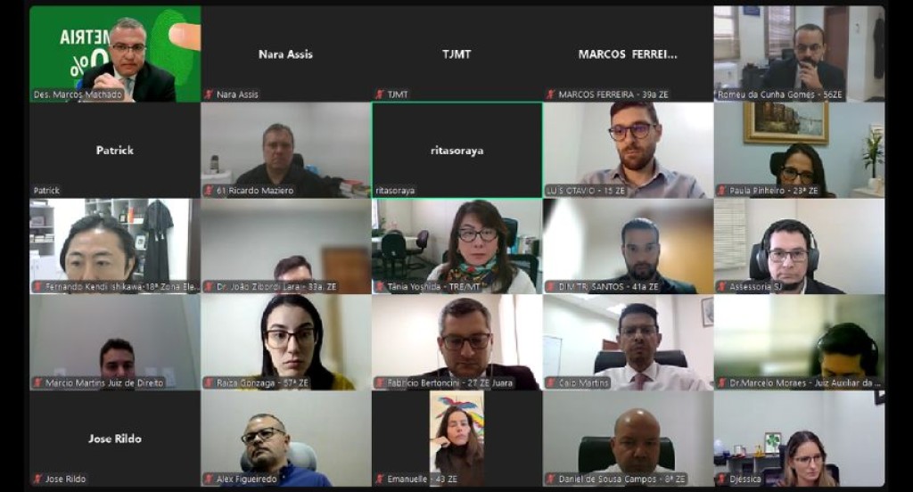 #PraTodosVerem: A imagem mostra uma reunião virtual realizada por videoconferência, com a participação de diversos servidores e magistrados ligados à Justiça Eleitoral do Mato Grosso (TRE-MT). Estão dispostos em uma grade de vídeo no estilo do Zoom, com nomes e cargos identificados em cada janela.