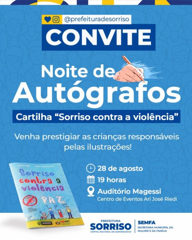 Palestras, abordagens orientativas, experimentos sociais, talk show e uma cartilha ilustrada por crianças para lembrar que violência contra a mulher é crime. Esses são alguns dos itens da lista desenvolvida no Agosto Lilás. E para falar mais da cartilha “Sorriso contra a violência”, na próxima quinta-feira, dia 28, será realizada uma “noite de autógrafos”. Todas a crianças que ilustraram a cartilha – uma iniciativa do Ministério Público de Mato Grosso e da Prefeitura Municipal, estarão presentes para falar dos desenhos criados.
