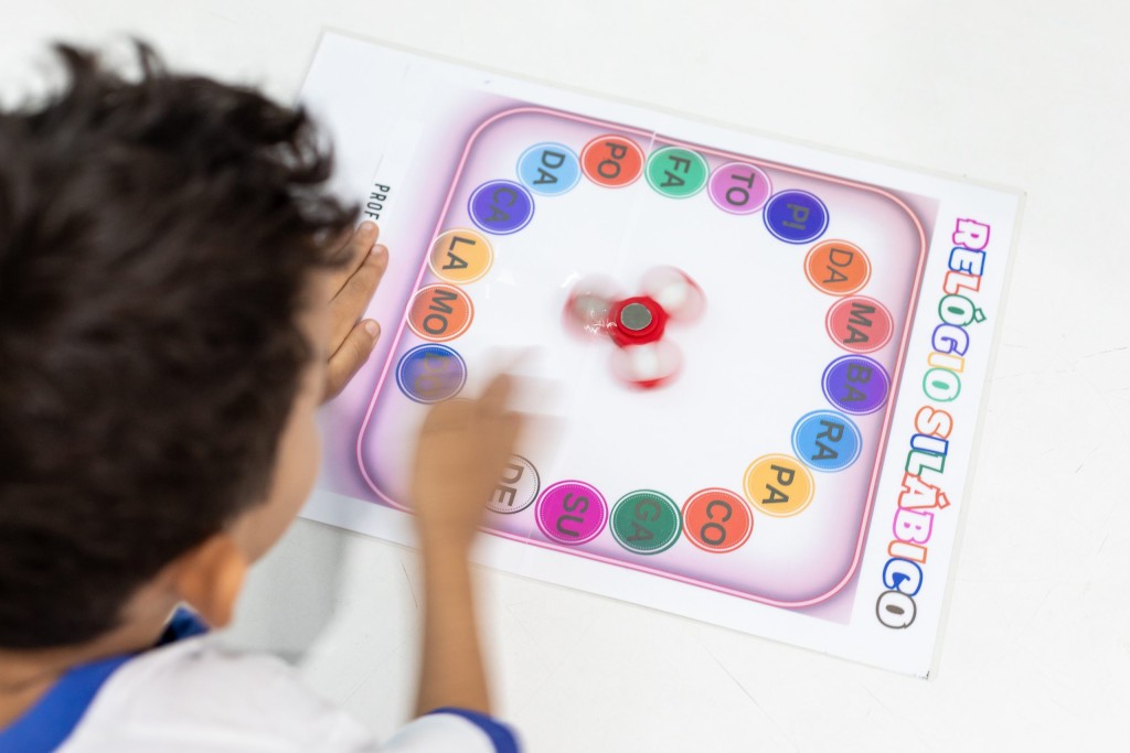 A foto ilustra uma criança, estudante de Cuiabá, desenvolvendo uma atividade educacional com relógio silábico. As peças são coloridas e está apoiado numa mesa de cor branca.