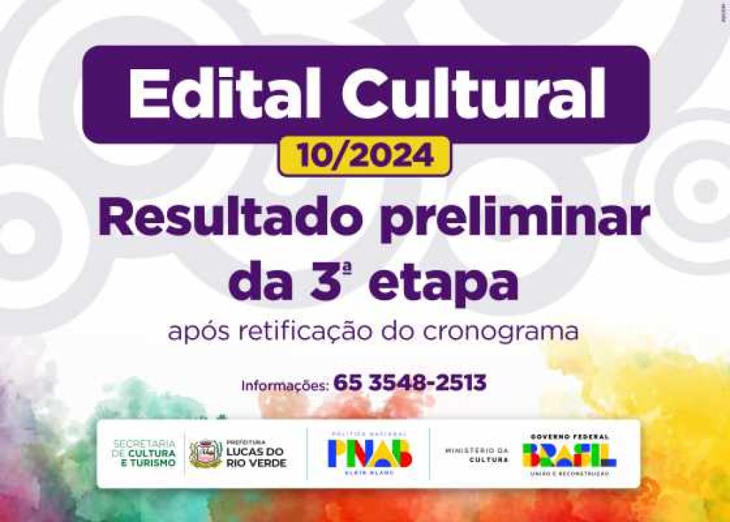 A Prefeitura de Lucas do Rio Verde, por meio da Secretaria de Cultura e Turismo, divulgou nesta terça-feira (15) o resultado preliminar da 3ª etapa (Habilitação Documental) do Edital nº 10/2024 – Premiação para Agentes Culturais, já com a retificação publicada.