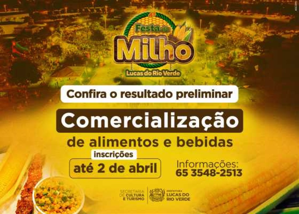 A Secretaria de Cultura e Turismo de Lucas do Rio Verde divulga nesta terça-feira (08) o resultado preliminar do processo de seleção para comercialização de alimentos e bebidas na praça de alimentação da 4ª Festa do Milho. Ao todo, 29 comerciantes se inscreveram para participar do evento. Confira o resultado no link. https://www.lucasdorioverde.mt.gov.br/arquivos/publicacoes/1919/resultado_preliminar_das_inscricoes_-_edital_de_selecao_n_001_2025_smct_assinado.pdf