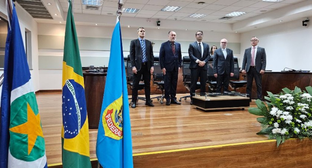 #PraTodosVerem: A imagem mostra cinco homens de terno em pé, posicionados na frente de uma mesa de plenário, em ambiente formal. No primeiro plano, aparecem as bandeiras de Mato Grosso, do Brasil e da Polícia Federal, além de um arranjo de flores, indicando a realização de um evento institucional. Ao final do texto, tem uma galeria com mais fotos do evento.