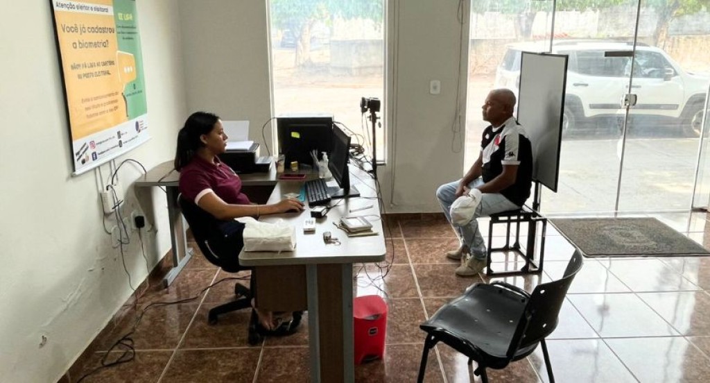 #PraTodosVerem – A imagem mostra um homem sendo atendido em um local de cadastro biométrico da Justiça Eleitoral. Ele está sentado em frente a uma atendente que opera um computador, enquanto ao lado há equipamentos para coleta de dados, como câmera e leitor biométrico. O ambiente é simples, com mesa, cadeiras e um cartaz na parede orientando sobre a biometria.