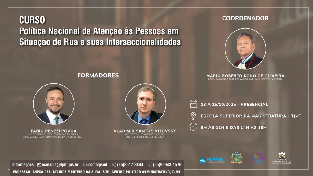 A Escola Superior da Magistratura de Mato Grosso (Esmagis-MT) e o Núcleo Permanente de Métodos Consensuais de Solução de Conflitos (Nupemec) realizam, no período de 13 a 15 de outubro, o curso de formação continuada “Política Nacional de Atenção às Pessoas em Situação de Rua e suas Interseccionalidades”. Ofertado para magistrados(as) e servidores(as) do Poder Judiciário de Mato Grosso, assim como demais órgãos do poder público, a capacitação será realizada presencialmente, das 8h às 12h e das 14h às 18h, na Esmagis. Ao todo, foram disponibilizadas 40 vagas.