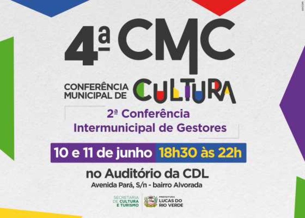 A Prefeitura de Lucas do Rio Verde, por meio da Secretaria de Cultura e Turismo, convida a comunidade para participar da 4ª Conferência Municipal de Cultura e da 2ª Conferência Intermunicipal de Gestores, que serão realizadas nos dias 10 e 11 de junho, no auditório da CDL. As inscrições são gratuitas e podem ser feitas por meio do link: https://docs.google.com/forms/d/e/1FAIpQLSe2Okn_2-tvYnZbBQGVMIVnIsOYY9SE6ShyBvsZ-3KP621dNw/viewform.