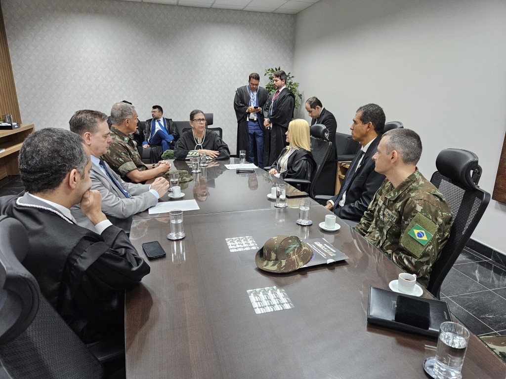 #PraTodosVerem: Foto que mostra a presidente, sentada em uma cadeira posicionada na ponta da mesa, e a corregedora do TRE-MT, ao lado direito, o general do Exército à esquerda, e demais participantes da conversa, também sentados ao redor da mesa. Ao fundo, aparecem alguns juízes-membros, de pé e outros sentados em um sofá.