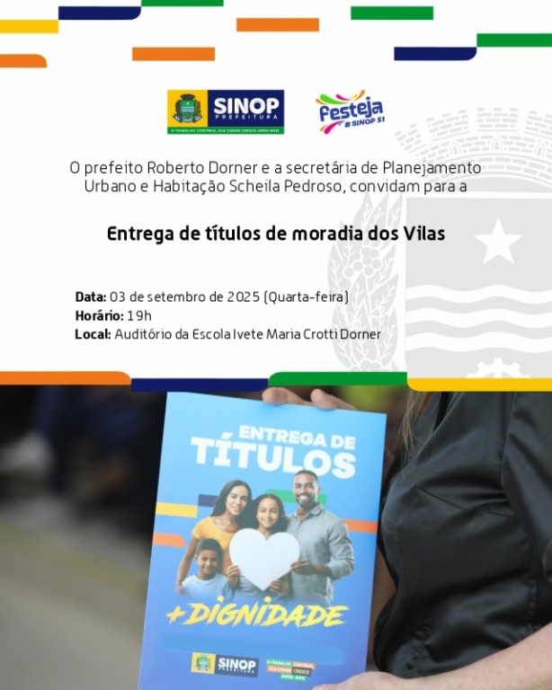 Nesta quarta-feira, três de setembro, às 19h, a Prefeitura de Sinop realiza na Escola Municipal de Educação Básica de Tempo Integral Ivete Maria Crotti Dorner, a entrega de 130 escrituras gratuitas, aos moradores do Residencial Vila Santana II e mais 224 títulos, em segunda chamada, dos Vilas Santana I, América, Mariana e Lobos I e II. A entrega faz parte de um projeto desenvolvido pela Secretaria de Planejamento Urbano e Habitação, que contempla os moradores com a isenção do pagamento do Imposto sobre Transmissão de Bens Imóveis (ITBI).