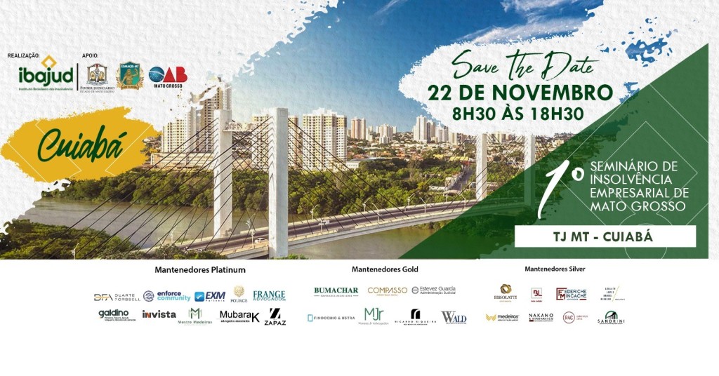 Estão abertas as inscrições para o 1º Seminário de Insolvência Empresarial de Mato Grosso, que será realizado no dia 22 de novembro pelo Instituto Brasileiro de Administração Judicial (Ibajud) em parceria com a Escola Superior da Magistratura de Mato Grosso (Esmagis-MT).O evento será realizado presencialmente, das 8h30 às 12h e das 14h às 18h30, no Auditório Espaço Justiça, Cultura e Arte, Desembargador Gervásio Leite (sede do Tribunal de Justiça), em Cuiabá. A carga horária é de 8 horas/aula.