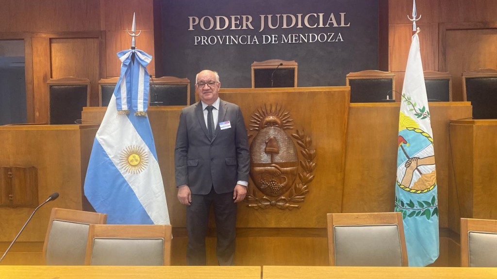 Esta matéria possui recursos de texto alternativo para promover a inclusão das pessoas com deficiência visual. Descrição de imagem: foto horizontal colorida do juiz Valmir Alaércio posando na frente do letreiro Poder Judicial Provincia Mendoza, em um plenário de madeira com bandeiras da Argentina e da província.