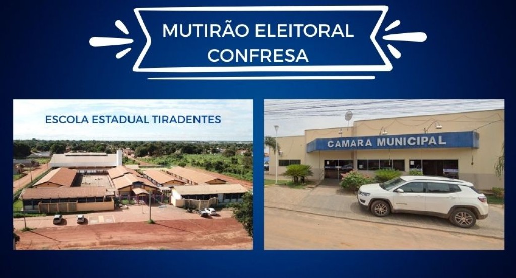 #PraTodosVerem: A imagem é um card informativo sobre o Mutirão Eleitoral em Confresa, destacando dois locais onde serão realizados os atendimentos: a Escola Estadual Tiradentes e a Câmara Municipal. O design utiliza fundo azul escuro com letras brancas, apresentando fotos das duas unidades que sediarão o mutirão, reforçando a divulgação da ação da Justiça Eleitoral no município.