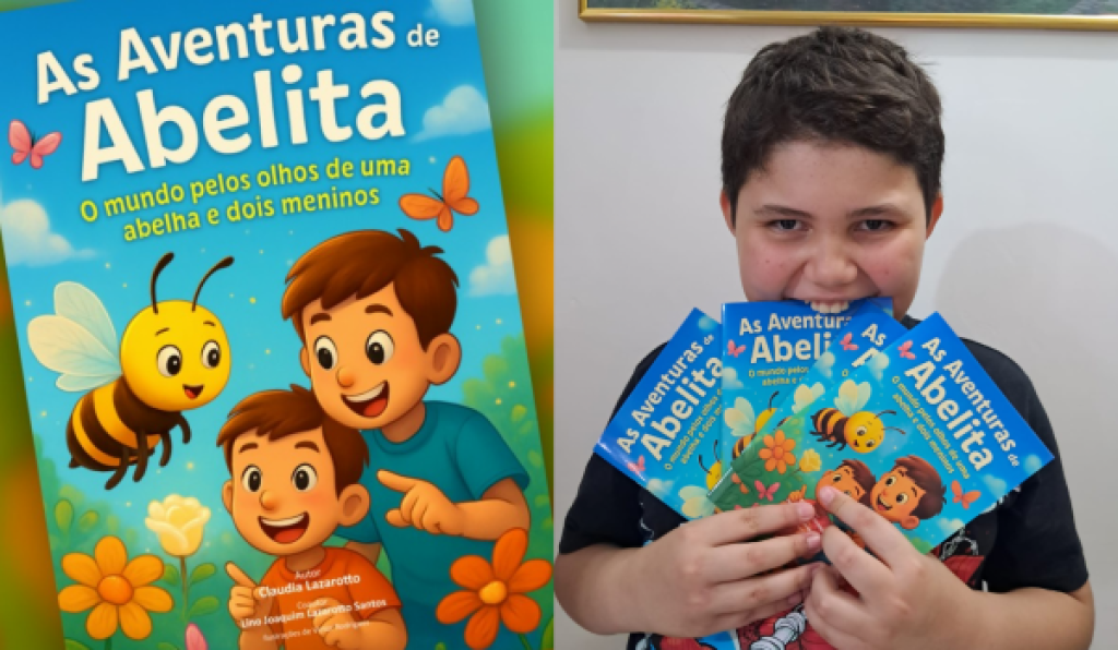 Um livro escrito a quatro mãos. Duas adulta e duas infantil. Esse é o mundo retratado em “As aventuras de Abelita: o mundo pelos olhos de uma abelha e dois meninos”, escrito pela jornalista Claudia Lazarotto em parceria com o filho, Lino Joaquim, de 10 anos. A história de Abelita e dos dois meninos – Lino e Vico, será lançada para o público infantil na segunda-feira, dia 06 de outubro, às 16 horas na Biblioteca Municipal Monteiro Lobato.