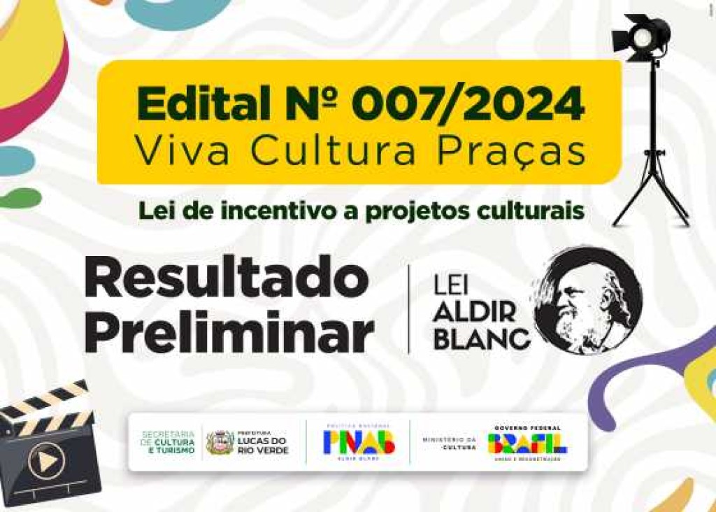 A Prefeitura de Lucas do Rio Verde, por meio da Secretaria de Cultura e Turismo, comunica que o resultado preliminar do Edital de Chamamento Público Nº 007/2024 “Viva Cultura – Praças”, já está disponível no site da Prefeitura.