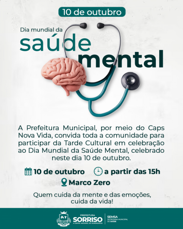Nesta sexta-feira, 10, em que se celebra o Dia Mundial da Saúde Mental, a equipe do Centro de Atenção Psicossocial (Caps) Nova Vida de Sorriso preparou uma Tarde Cultural cheia de apresentações culturais e atividades de integração. O evento acontecerá a partir das 15h, no Marco Zero, e é aberto a toda a comunidade.