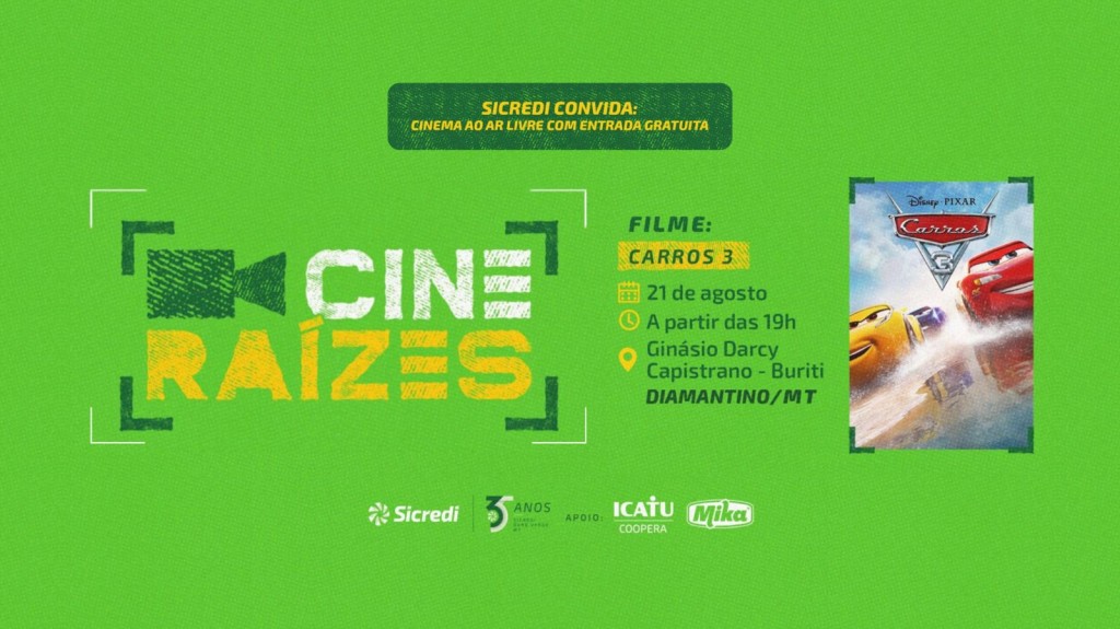 No dia 21 de agosto, a partir das 19h, Diamantino recebe o projeto Cine Raízes, com a exibição gratuita do filme “Carros 3”, na praça em frente ao Ginásio Poliesportivo Darcy Capistrano, no bairro Buriti. O evento é aberto a toda a comunidade e conta com distribuição de pipoca e refrigerante, garantindo diversão para todas as idades.