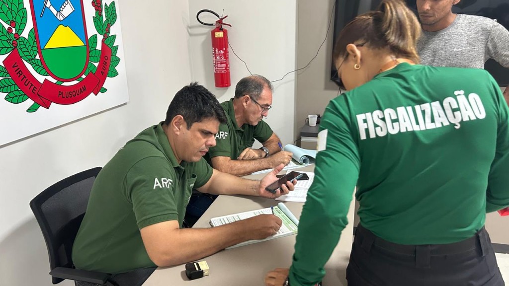 A imagem é ilustrada com três fiscais da Ordem Pública vestidos com camisa verde confeccionando autos de infração. Dois estão sentados e uma terceira, mulher, está em pé apoiada numa mesa.