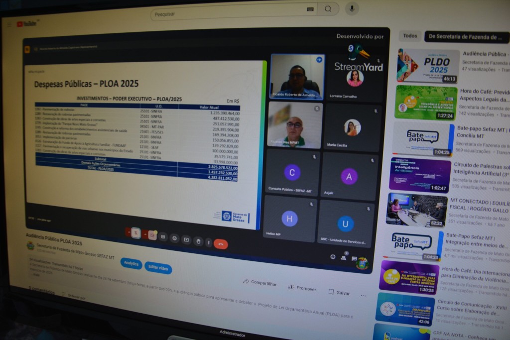O PLOA contempla as receitas e despesas estimadas do Governo do Estado, além de informações sobre investimentos, renúncia fiscal, operações de créditos e indicadores macroeconômicos. Os dados foram apresentados durante a audiência pública virtual, transmitida pelo canal da Sefaz-MT, no YouTube.