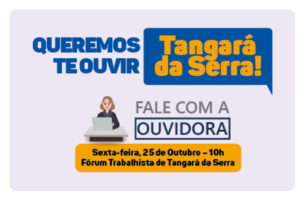 O atendimento será realizado pela ouvidora, desembargadora Beatriz Theodoro, das 10h às 12h, no Fórum Trabalhista de Tangará da Serra.