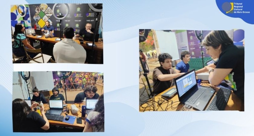 #PraTodosVerem: A imagem reúne três registros fotográficos de atendimentos realizados pelo TRE-MT em um estande montado no Festival de Inverno de Chapada dos Guimarães. Servidores utilizam computadores e equipamentos de biometria para realizar serviços eleitorais como emissão de títulos e atualização cadastral. O ambiente é dinâmico, com a participação ativa da população, incluindo jovens. O estande é identificado com logomarcas do TRE-MT e conta com estrutura organizada para atendimento eficiente.