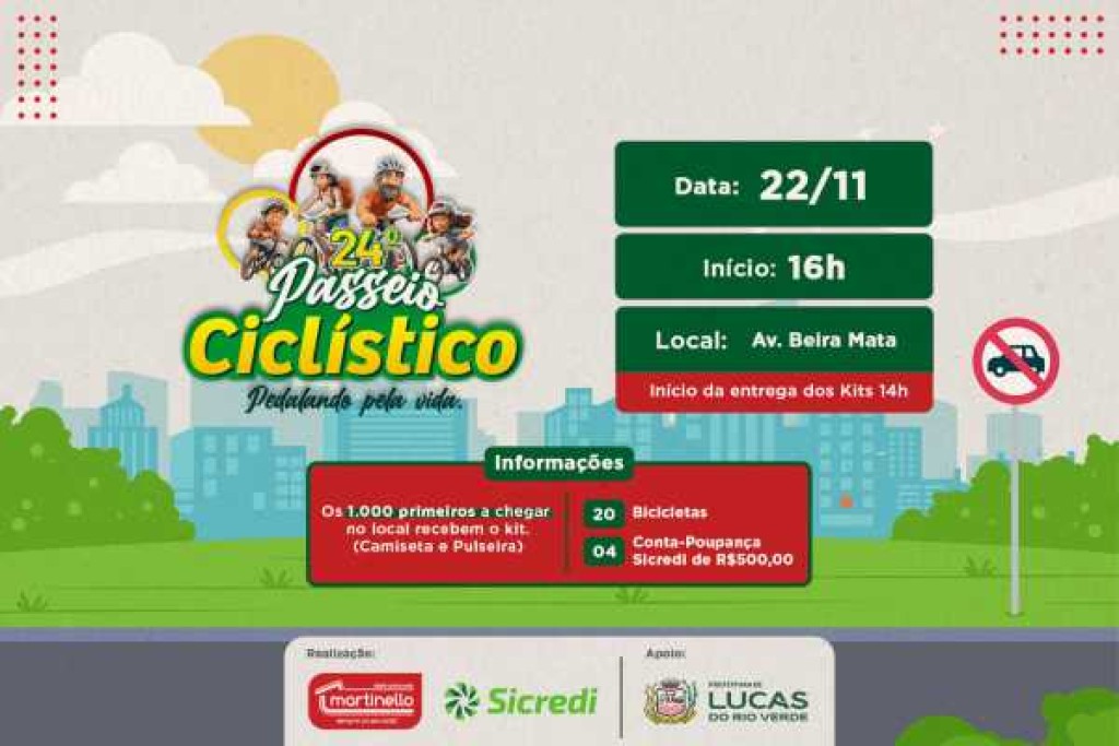 Mantendo a tradição de reunir centenas de pessoas em uma tarde de pedal e diversão, a Prefeitura de Lucas do Rio Verde, em parceria com a Eletromóveis Martinello e o Sicredi, convida a população para a 24ª edição do Passeio Ciclístico Pedalando pela Vida.