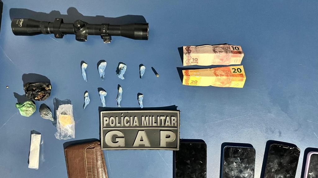 No interior da casa, outros dois suspeitos foram flagrados e detidos. Ao todo, foram apreendidos dez porções de pasta base de cocaína, três de maconha, cinco aparelhos celulares, uma munição calibre .22 e uma luneta para arma de fogo.
