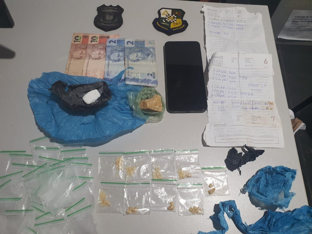 O suspeito, de 34 anos, foi autuado em flagrante por tráfico de drogas e ameaça no âmbito da violência doméstica e familiar. Com ele, foram apreendidas várias porções de pasta base de cocaína e dinheiro.