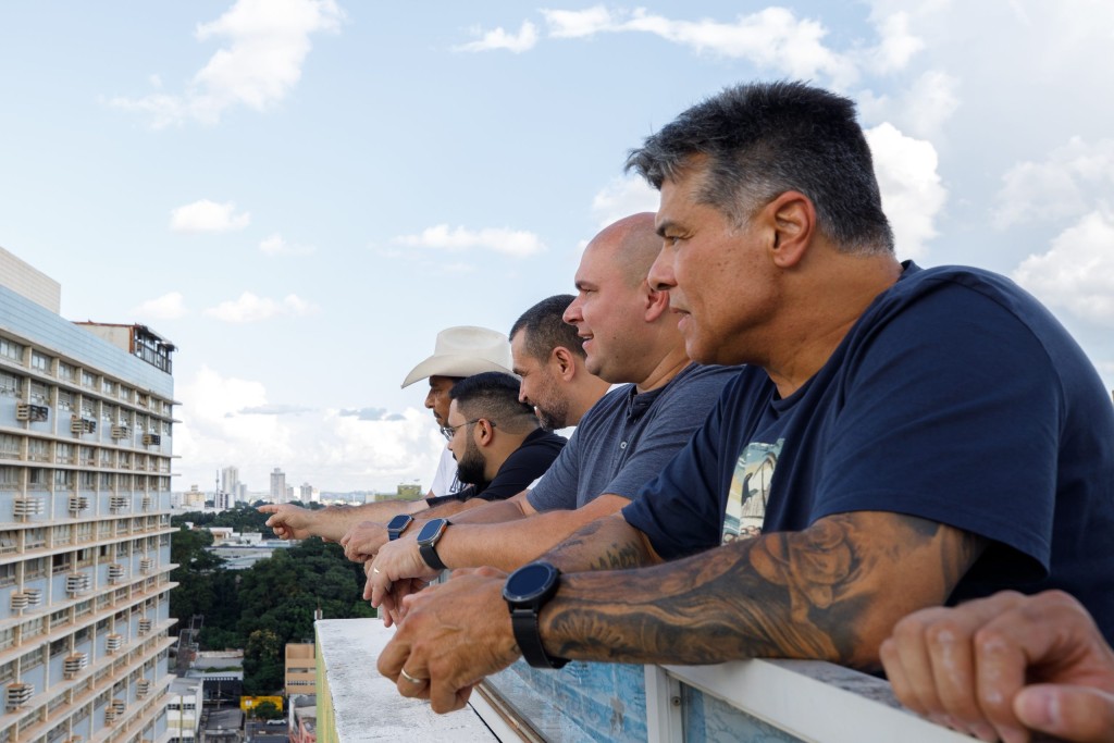 A foto registra o momento em que o prefeito Abilio Brunini mostra a cidade de Cuiabá ao cantor Maurício Mattar, numa visão ampla do terraço do Palácio Alencastro, sede da Prefeitura de Cuiabá. Os secretários de Cultura, Johnny Everson, de Turismo, Fernando Medeiros e o de Esporte e Lazer, Jefferson Neves também estão na imagem.