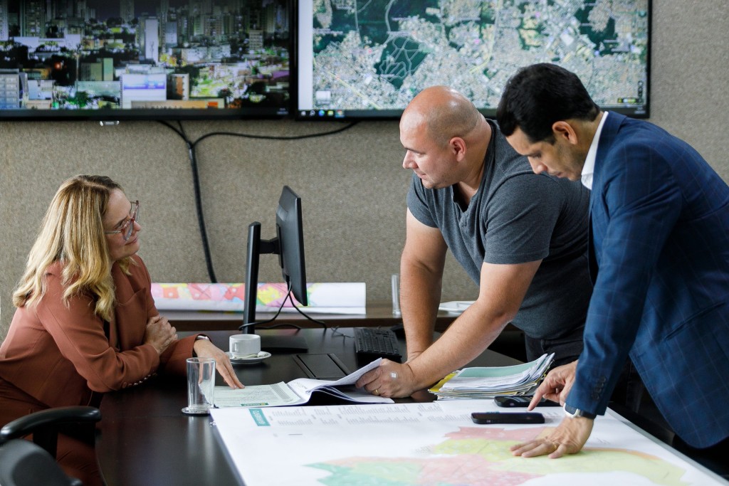 A imagem que ilutra essa notícia mostra o prefeito Abilio Brunini em pé, de camisa cinza, mostrando um mapa de Cuiabá para a promotora Maria Fernanda, que está sentada na mesa de reunião de roupa marrom. Ao lado de Abilio está Willian Campos, usando terno e acompanhando a explicação.
