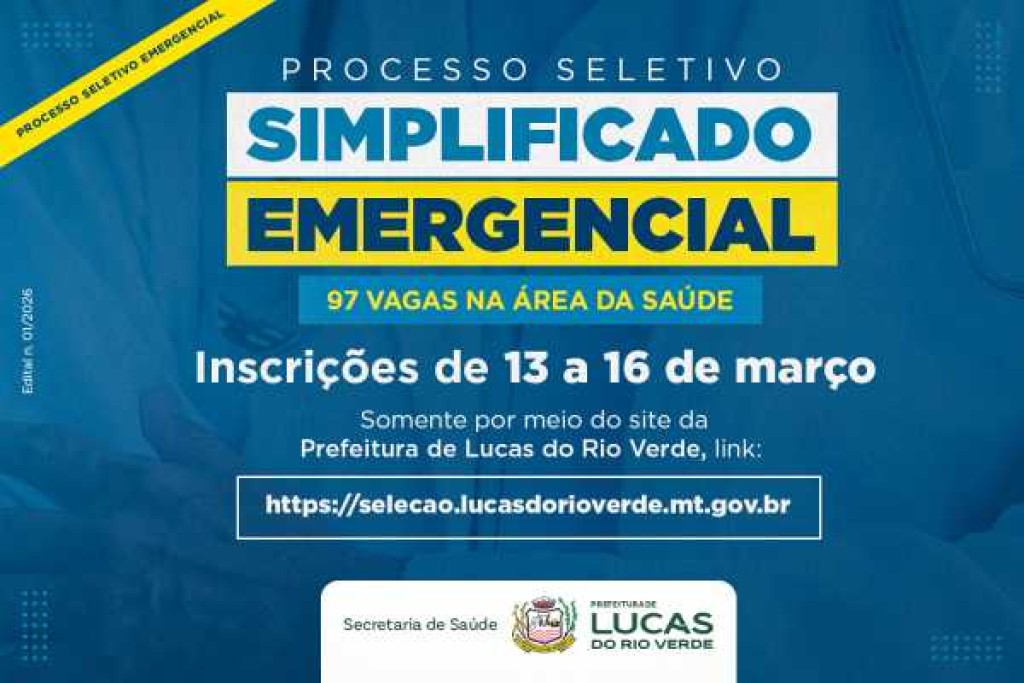 Começam nesta sexta-feira (13), as inscrições para o Processo Seletivo Simplificado Emergencial, Edital n. 01/2026, aberto pela Prefeitura de Lucas do Rio Verde.