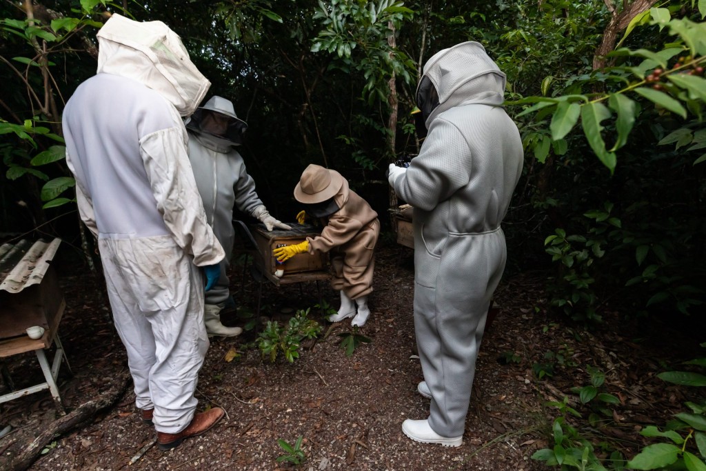 A imagem mostra o manejo de uma caixa de abelha, por quatro pessoas vestidas com equipamentos de proteção individual, em ambiente rural. A roupa é uma espécie de proteção que cobre todo o corpo e cabeça, de modo a evitar ferroadas de abelhas.