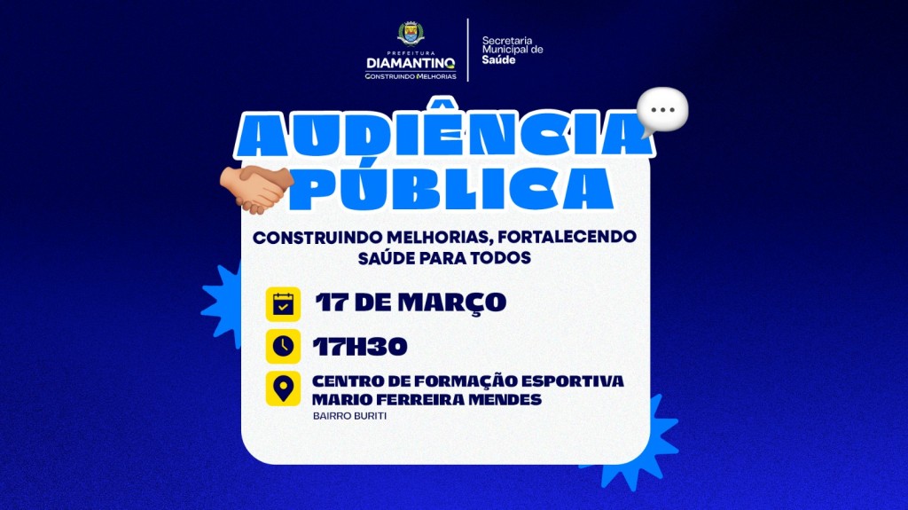 A Prefeitura de Diamantino, por meio da Secretaria Municipal de Saúde, realizará no dia 17 de março de 2026, às 17h30, a audiência pública “Construindo Melhorias, Fortalecendo Saúde Para Todos”, voltada à discussão sobre a Atenção Primária à Saúde. O encontro acontecerá no Centro de Formação Esportiva Mario Ferreira Mendes, no bairro Buriti, e é destinado aos moradores atendidos pela Estratégia de Saúde da Família do Buriti.