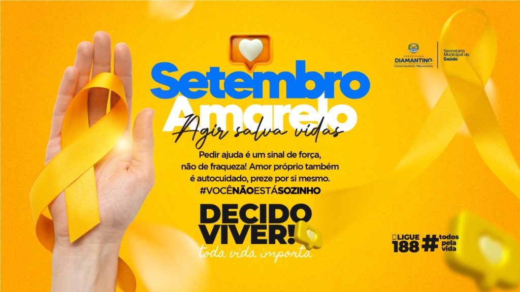 A Prefeitura de Diamantino, por meio da Secretaria Municipal de Saúde, inicia neste mês a campanha Setembro Amarelo, que em 2025 tem como tema “Agir salva vidas”. Criada em 2015, a campanha é um movimento nacional de prevenção ao suicídio realizado anualmente.