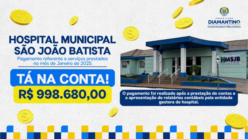 Nesta sexta-feira (28.02), a Prefeitura de Diamantino efetuou o pagamento de R$ 998.680,00 (novecentos e noventa e oito mil, seiscentos e oitenta reais) ao Instituto Primeiro, Organização Social responsável pela administração do Hospital Municipal São João Batista. O valor é proveniente de recursos próprios do município, além de repasses do Governo de Mato Grosso e do Governo Federal.