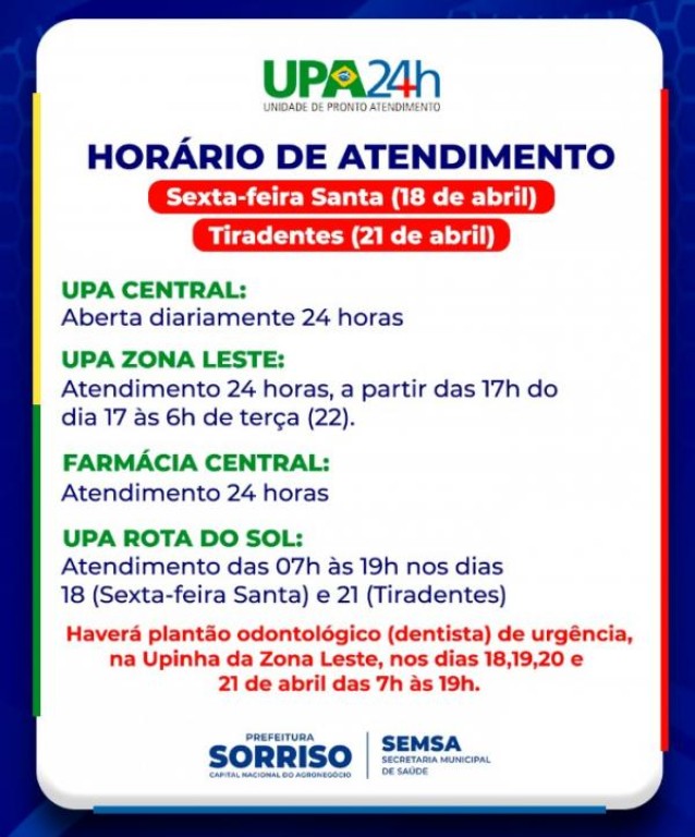 Upinha Zona Leste: Funcionará ininterruptamente de sexta-feira (18 de abril), às 18h, até terça-feira (22 de abril), às 6h. Durante o feriado, também haverá plantão odontológico (dentista) de urgência, das 7h às 19h.