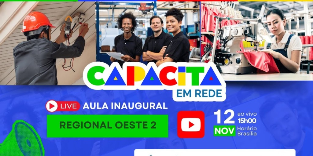 Esta matéria possui recursos de texto alternativo para promover a inclusão das pessoas com deficiência visual. Imagem 1: A imagem é um pôster promocional de um evento ao vivo intitulado “Aula Inaugural” para “Regional Oeste 2”. Apresenta o texto “Capacita em Rede” em destaque. O evento está marcado para o dia 12 de novembro, às 15h, horário de Brasília. O lado direito da imagem mostra três pessoas envolvidas em atividades diferentes. No topo, uma pessoa usando um capacete vermelho está usando um martelo. Abaixo, duas pessoas estão juntas, com o rosto de uma pessoa borrado. Na parte inferior, uma pessoa está operando uma máquina de costura com tecido vermelho. O design geral inclui elementos que indicam uma transmissão ao vivo, como um ícone de botão de reprodução e a palavra “AO VIVO”.