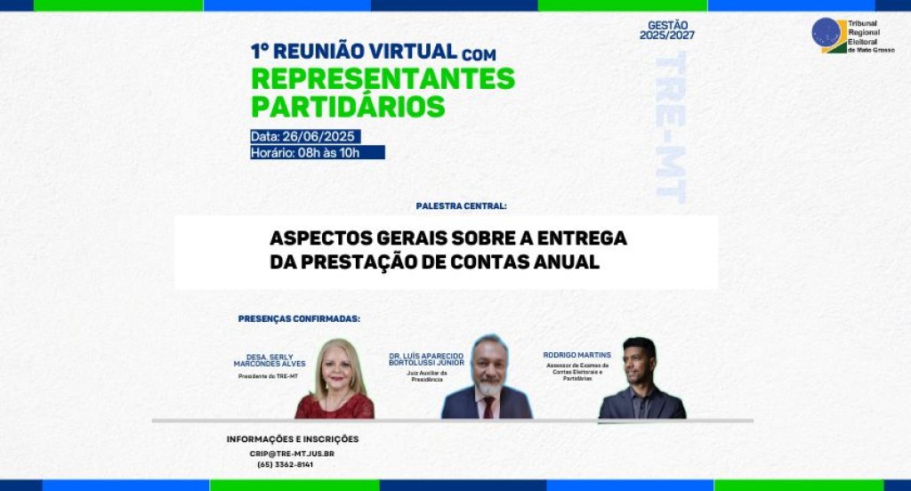 #PraTodosVerem: A imagem é um card de divulgação do TRE-MT sobre a “1ª Reunião Virtual com Representantes Partidários”, que acontecerá no dia 26 de junho de 2025, das 8h às 10h. O tema central será “Aspectos Gerais sobre a Entrega da Prestação de Contas Anual”. O card destaca a presença confirmada de três participantes: a presidente do TRE-MT, Desa. Serly Marcondes Alves; o juiz auxiliar da Presidência, Dr. Luís Aparecido Bortolussi Júnior; e Rodrigo Martins, assessor de contas de campanhas e de partidos. Informações e inscrições estão disponíveis pelo e-mail [email protected] ou pelo telefone (65) 3362-8141.
