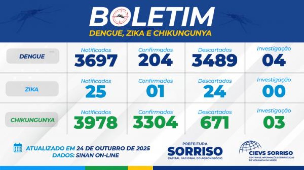 Hoje os bairros com maior número de registros de chikungunya estão o Vila Bela com 257; Rota do Sol com 201 casos; São José com 159; Nova Aliança I com 148 registros; Jardim Amazônia com 145 e Novos Campos com 137 situações positivas. O antigo distrito de Boa Esperança e atual município vizinho de Boa Esperança contabilizou 376 registros – vale lembrar que no Ministério da Saúde, Boa Esperança ainda consta veiculado à Sorriso. Já em relação à dengue são 15 casos no Rota e 13 no Jardim Amazônia. O caso de zika foi registrado no bairro União.