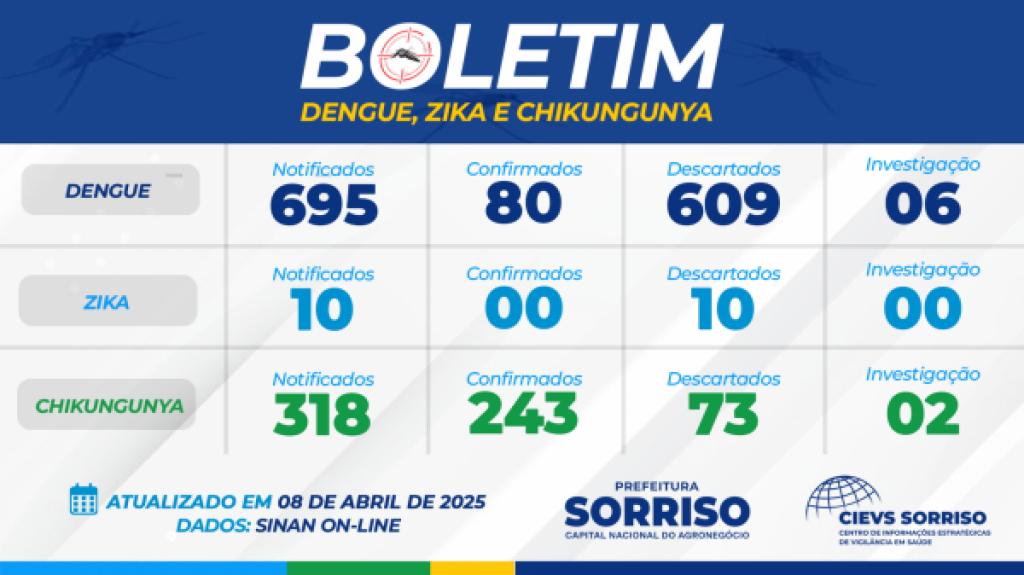 A Secretaria de Saúde, por meio do Centro de Informações Estratégicas de Vigilância em Saúde (Cievs), divulgou hoje, 08 de abril, o número de casos de arboviroses como dengue, chikungunya e zika vírus registrados desde 1.º de janeiro de 2025 até o momento. No mês de janeiro foram 65 confirmações de dengue, uma com sinais de alarme; em fevereiro foram registrados 11 casos e em março mais quatro registros, totalizando 80 casos até o momento. Já em relação à chikungunya, foram 59 confirmações em janeiro, 88 em fevereiro e 96 em março, somando 243 registros. Dez notificações para zika foram investigadas e descartadas. Os números constam no Sistema Sinan On-line.