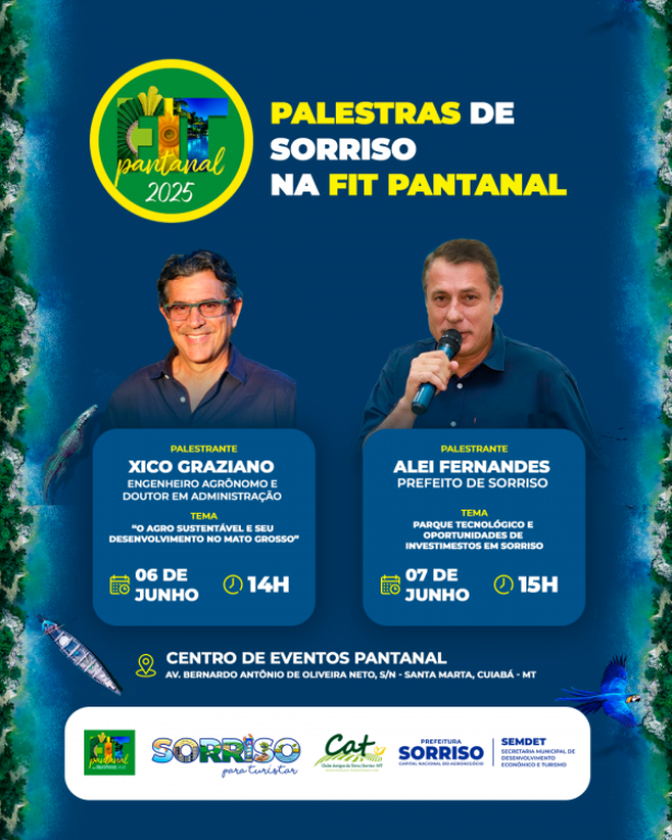 No dia seguinte, 7 de junho, às 15h, no Auditório das Flores, o prefeito de Sorriso, Alei Fernandes, ministrará a palestra “Oportunidades de Investimentos e Empregos em Sorriso”. Ele destacará as iniciativas do município para atrair investimentos e gerar empregos e o papel de Sorriso no desenvolvimento regional.