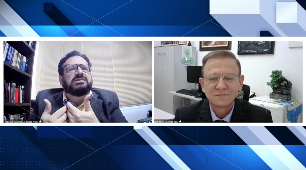#ParaTodosVerem – Esta matéria possui recursos de texto alternativo para promover a inclusão das pessoas com deficiência visual. Imagem 1: Print de tela que mostra uma conversa por videoconferência entre os juízes Gonçalo Antunes e Wanderlei Reis, que estão divididos em duas telas, com um fundo de tons azuis.